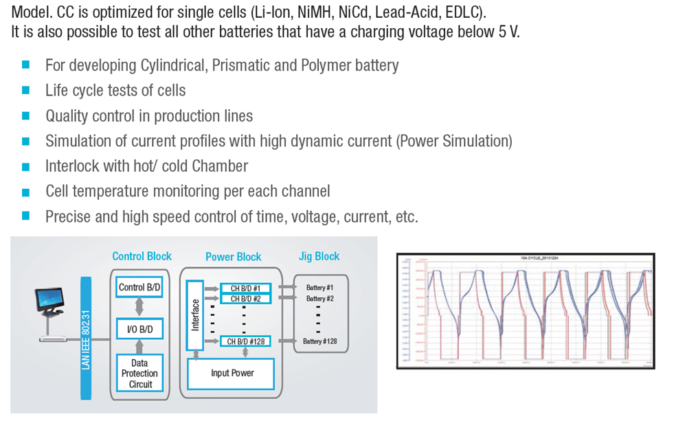 Testing equipment for lifecycle property. We supply cell cycler unit adjusted for line to line specifications. Availabel from single unit supply.