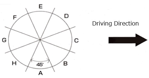 If the average of A and E points among the divided 8 sections is taken, it indicates the MPD for driving direction. The average of B,F and D,H indicates MPD for 45° to the direction of travel. The overall MPD can also be obtained as the average of A through H segments.