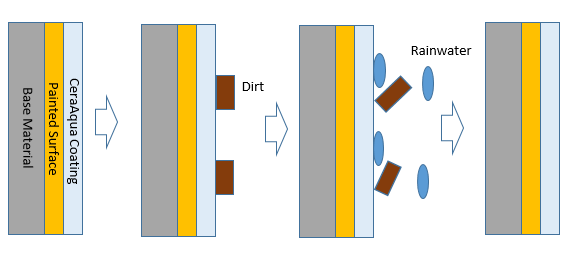 Painted surfaces, tiles, glass, and metal surfaces under outdoor environment are tend to be discolored to black due to contamination in the air. CeraAqua coating, with its hydrophilicity, gives self-cleaning property to the surfaces, which removes dirts by rainwater restoring the surface to its original condition.
