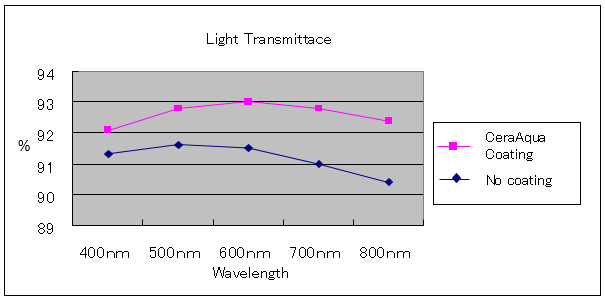 Because the film coated with CeraAqua consists of inorganic polysilicate, it forms highly light-transmissive layer insoluble in water. It is very stable to ultraviolet and infrared rays causing no discoloration or degradation of light transmittance.